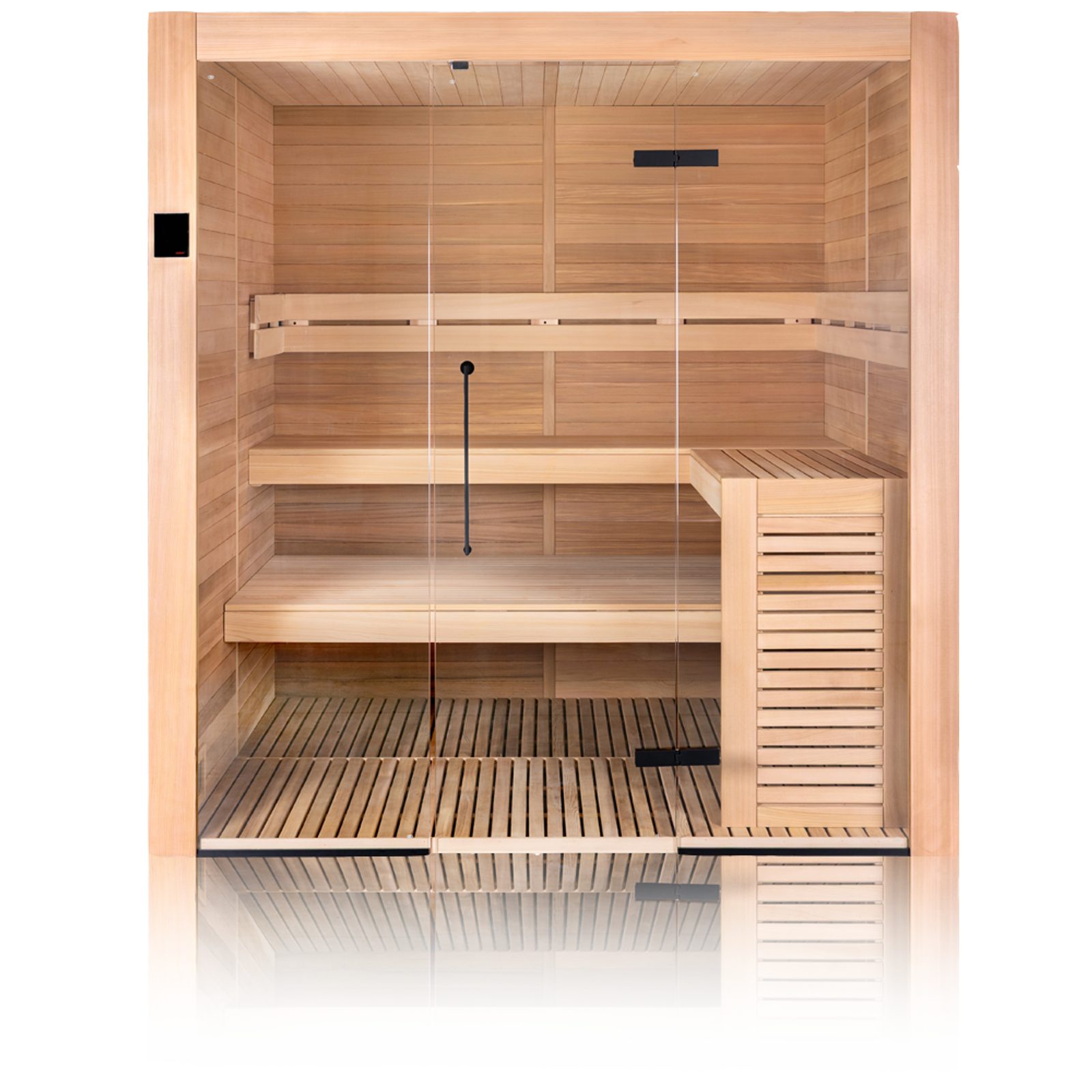 Espoo Grand patří mezi nejoblíbenější varianty. Čistý a elegantní design se hodí jak do moderního, tak klasického interiéru. Sauna je vyrobená z vysoce kvalitního červeného vedru, který se řadí mezi nejlepší materiály do sauny. Jeho přirozená vůně má terapeutické účinky. Sauna je velmi prostorná, vhodná pro 3 - 4 osoby.