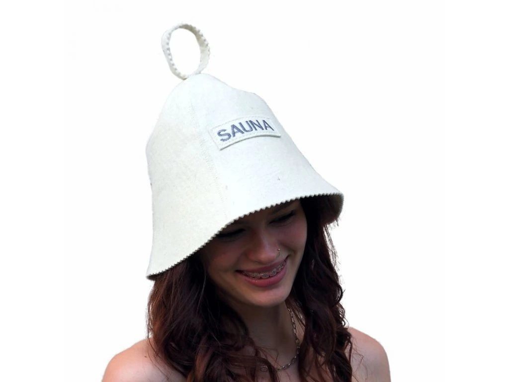 Klasický a nadčasový saunový klobouk s výšivkou SAUNA. Univerzální klobouk do sauny vhodný pro muže i ženy. Čepice je vyrobena z kvalitní ovčí vlny. V provedení bílá.