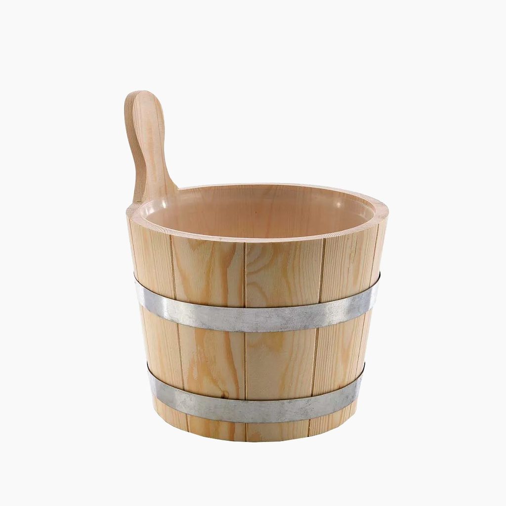 Krásně zpracované saunové vědro, které díky svému designu lze využít i jako květináč na zahrádku, či do zimních zahrad. Vyrobeno z měkkého jehličnatého dřeva, opatřeno plastovou vložkou, která chrání dřevo v saunovém vědru proti poškozování vodou. Jednotlivé dřevěné díly vědra jsou pevně svázané 2 pozinkovanými páskami z železné obruče.