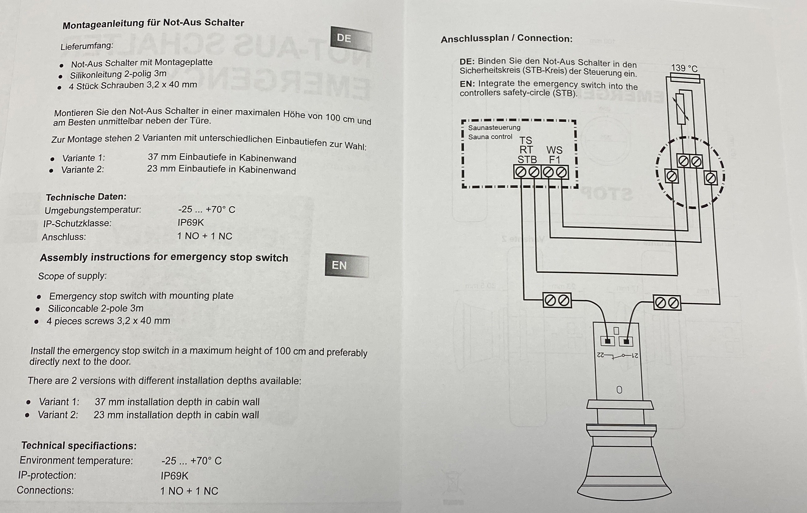 Nouzové tlačítko pro saunové kabiny. S dvěma oddělenými spínací obvody (1x běžně otevřený, 1x běžně uzavřený). Extra dlouhá skříňka pro snadnou instalaci se šroubovým upevněním. Dvě samostatná opatření (například vypnutí topení a zvuková signalizace, kabeláží se zde dá zapojit druhý vstup (kontrolka, alarm), který dostane následně signál. Musí se kabel vejít do otvor 40mm.)