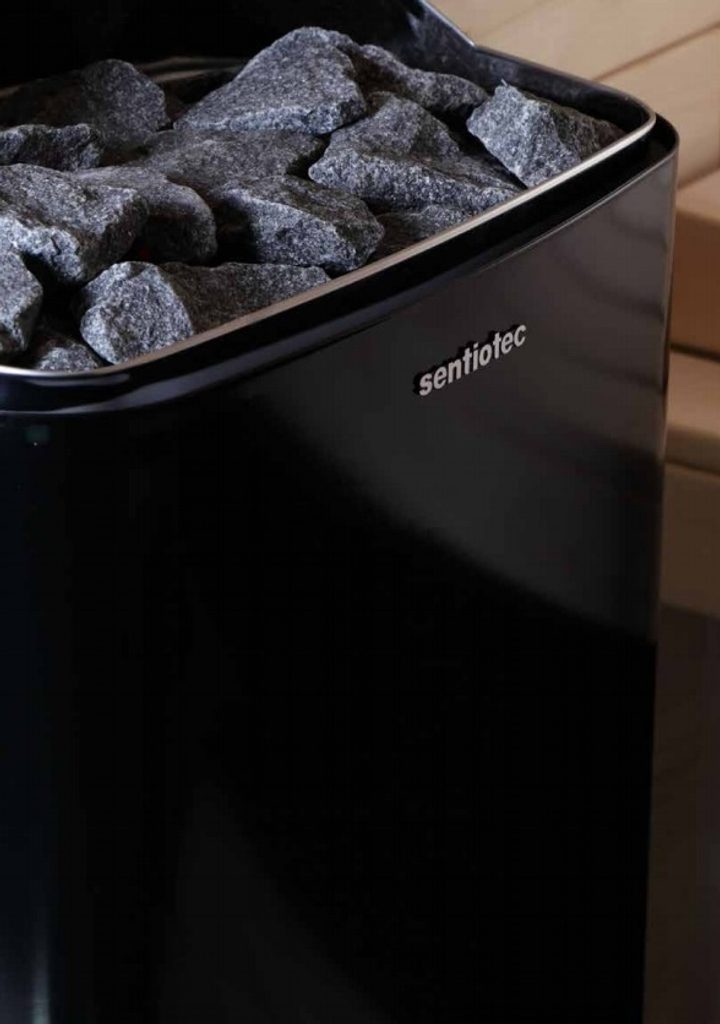 Elektrická saunová kamna Sentiotec 100 s integrovanou řídící jednotkou v černém provedení o výkonu 4,5kW, jsou určena do sauny o velikosti 3 až 6 m.