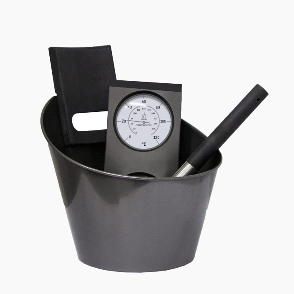 Prémiový set saunového příslušenství od Harvie - ty nejluxusnější doplňky do sauny, jaké může Finsko nabídnout. Černé nerezové provedení v kombinaci s lakovaným dřevem. Vědro má objem 4 litry, naběračka má 0,2 litru. Teploměr s vlhkoměrem jsou umístěny vedle sebe.