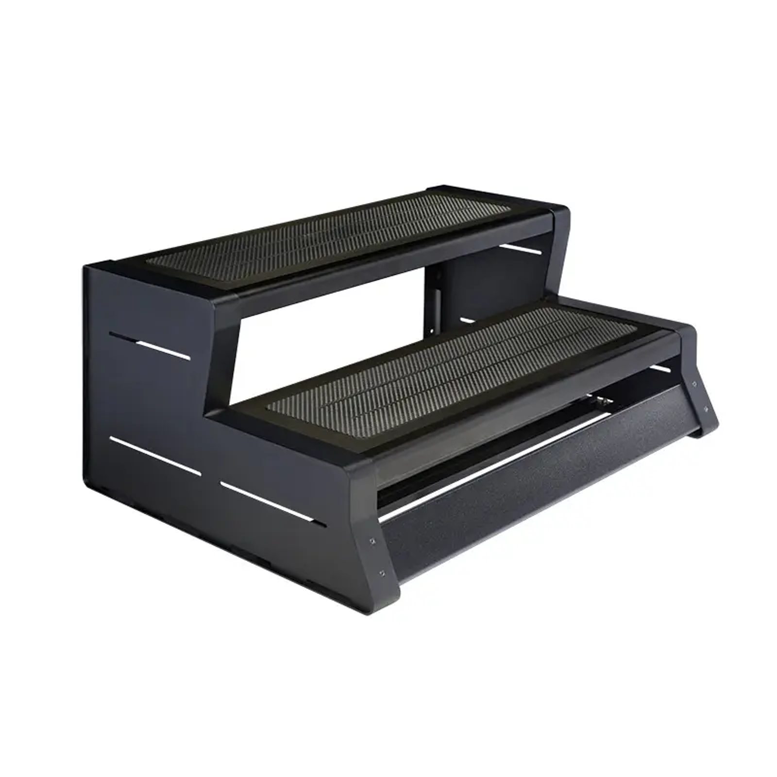 ModStep 2 atraktivní, odolné dvoustupňové schůdky. Černý rám z práškově lakovaného hliníku s polymerovými běhouny. Gumové, protiskluzové, měkké nášlapy jsou velmi příjemné.