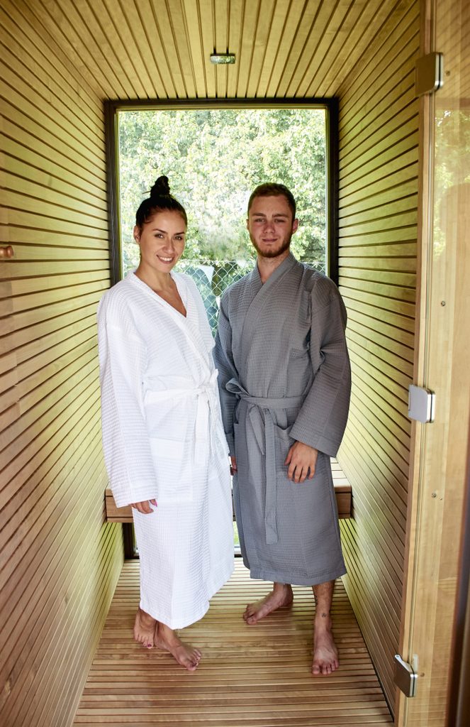 Univerzální vaflový župan do sauny ve střihu připomínajícím kimono v bílé barvě udělá radost jak dámám, tak pánům. Vhodný do wellness, bazénů, saun i na běžné nošení. Župan je vyroben z bavlny. Vaflový materiál je ideální pro použití v sauně. Je lehoučký, měkký a velmi příjemný. Navíc skvěle saje vodu a pot a rychle usychá.