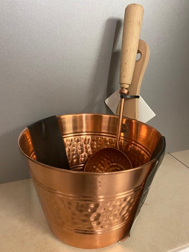Saunový set Saunia obsahuje měděné vědro vč lžíce. Elegantní, nadčasový vzhled. Dřevěné rukověti v barvě světlého dřeva skvěle podtrhují celiství vzhled. Objem vědra 4L.