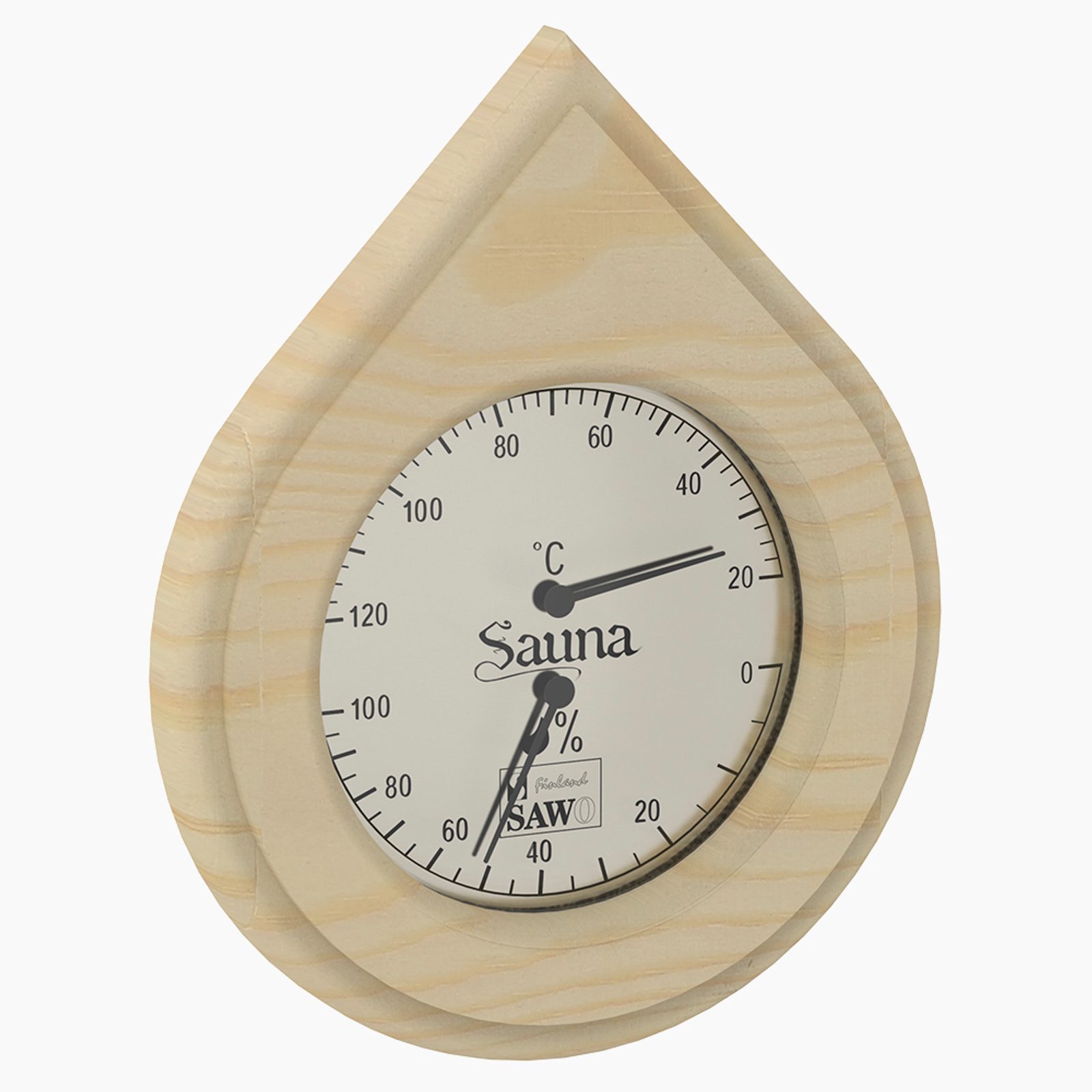 Tělo přístroje je vyrobeno z ošetřeného borovicového dřeva odolné vůči vysoké vlhkosti a teplotě. Mechanická stupnice vlhkosti od 0 do 100 % a mechanická stupnice teploty od 20 do 120 C. Teploměr a vlhkoměr jsou důležitým a užitečným doplňkem, který umožňuje regulovat klima v sauně podle individuálních preferencí uživatele. Teploměr s vlhkoměrem má na zadní straně zdířku pro uchycení na zeď.