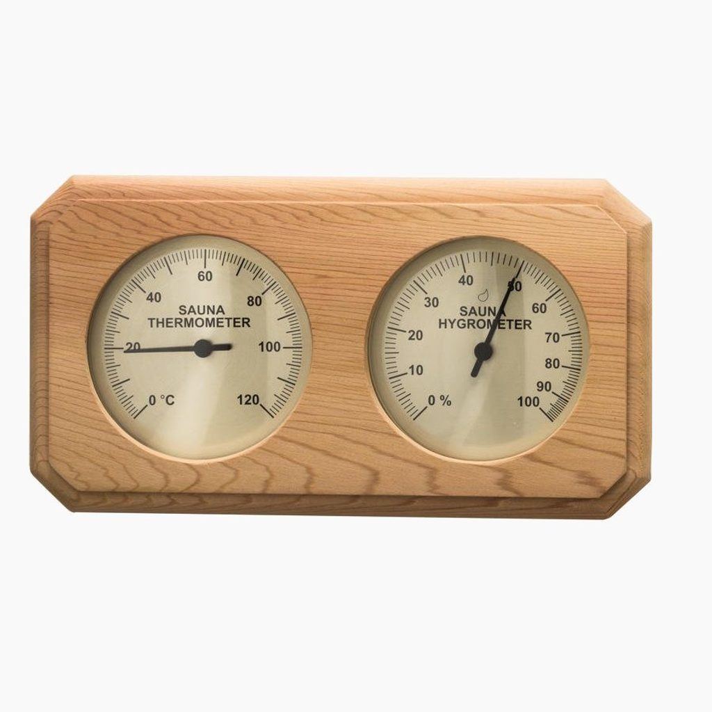 Elegantní teploměr s vlhkoměrem ve zlatém provedení, vyráběn z borovice nebo cedru. Vhodný především do saun v obdobném dřevěném provedení. Zaoblený teploměr s vlhkoměrem je vhodným doplňkem do každé sauny pro kontrolu podmínek, které v sauně panují.