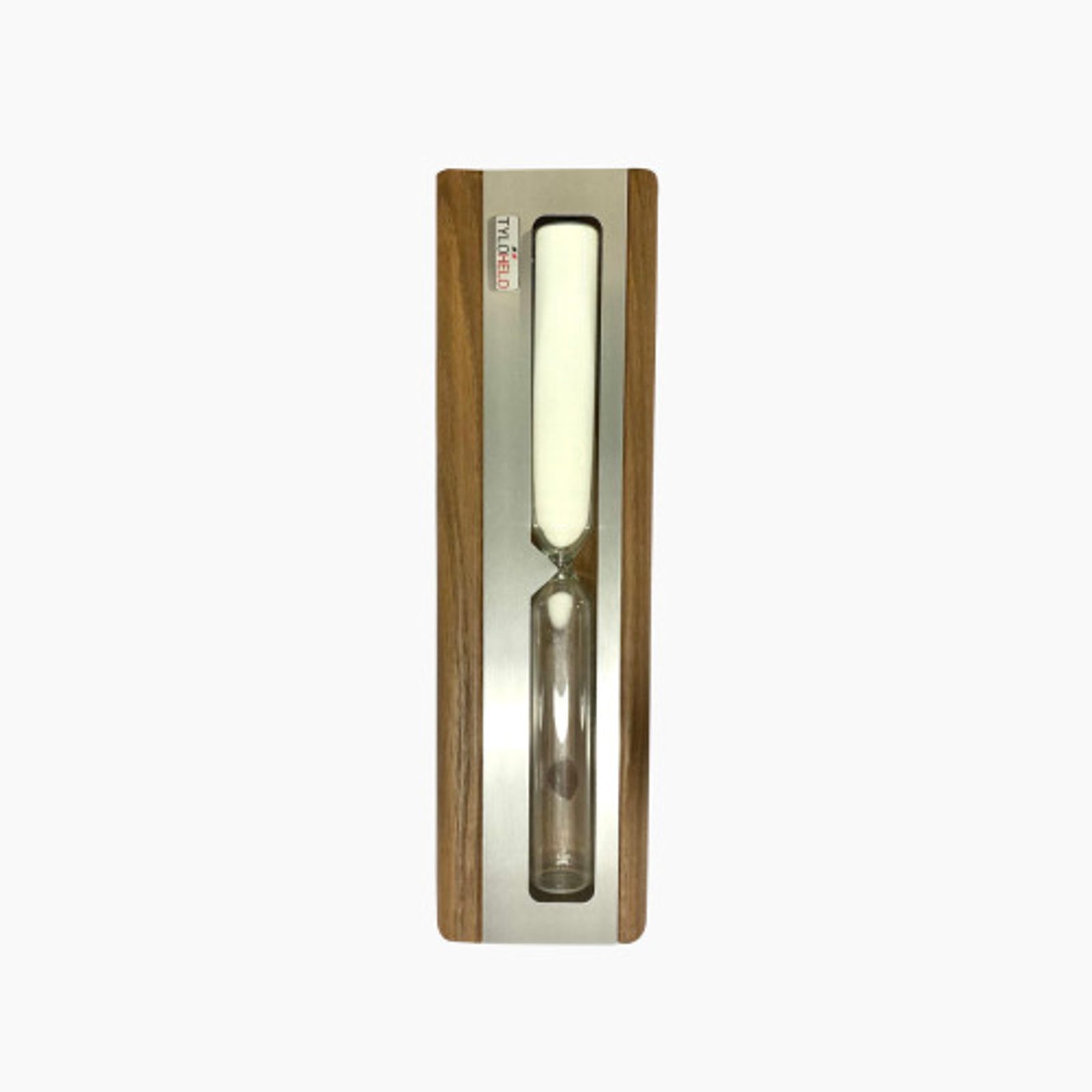 Přesýpací hodiny Premium z kolekce prestižních doplňků pro sauny. Luxusní dřevěné, přesýpací hodiny odměřující čas 20 minut určené do interiérových saun, vyrobené v provedení kombinace tmavého dřeva a kovového rámečku.