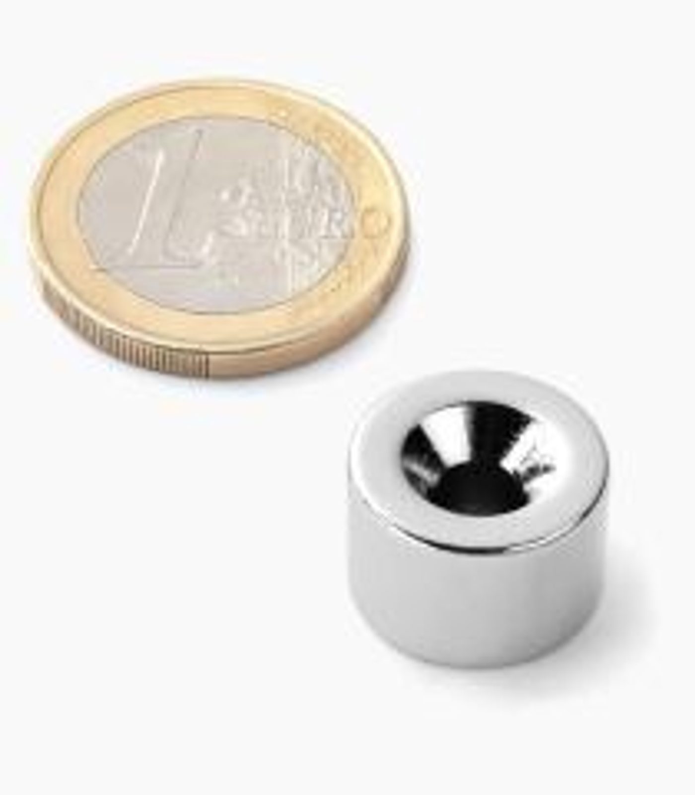 Neodymový kruhový magnet s magnetickou silou 7,2 kg a prohlubní na šroub. Slouží na magnetické uzavírání saunových dveří.