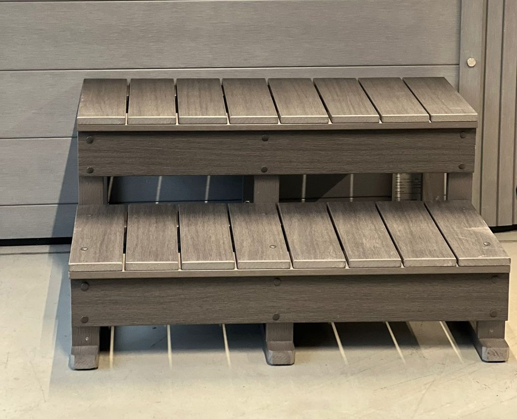 Elegantní schůdky k vířivce Quantum dodávané ve dvou barevných variantách, broušená šedá, broušená hnědá. Vyrobeno v jednoduchém nadčasovém designu.