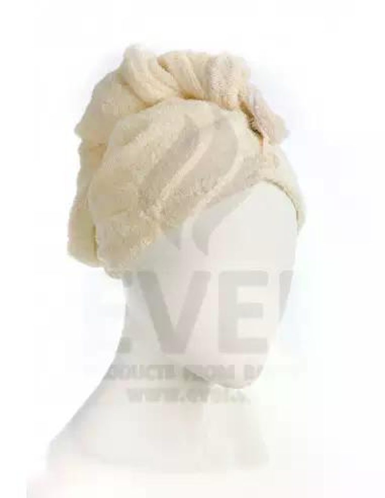 Turban nebo ručník na vlasy. Ručník na vlasy, jednoduše ovinete kolem hlavy a zapnete knoflíkem. Je velmi příjemný a měkký. Vyrobený z měkké česané bavlny. Výborná ochrana hlavy a mokrých vlasů nejen v sauně či po sauně, ale také doma po koupeli. Také jej můžete využít ik zabalení suchých vlasů, aby se vám nenamočili při koupeli.